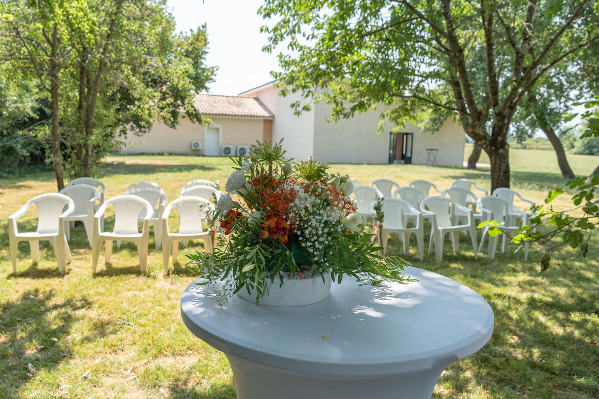 À l’extérieur : un préau couvert, un grand jardin, des coins ombragés et une vue panoramique sur les Pyrénées pour vos cérémonies laïques et vos photos.